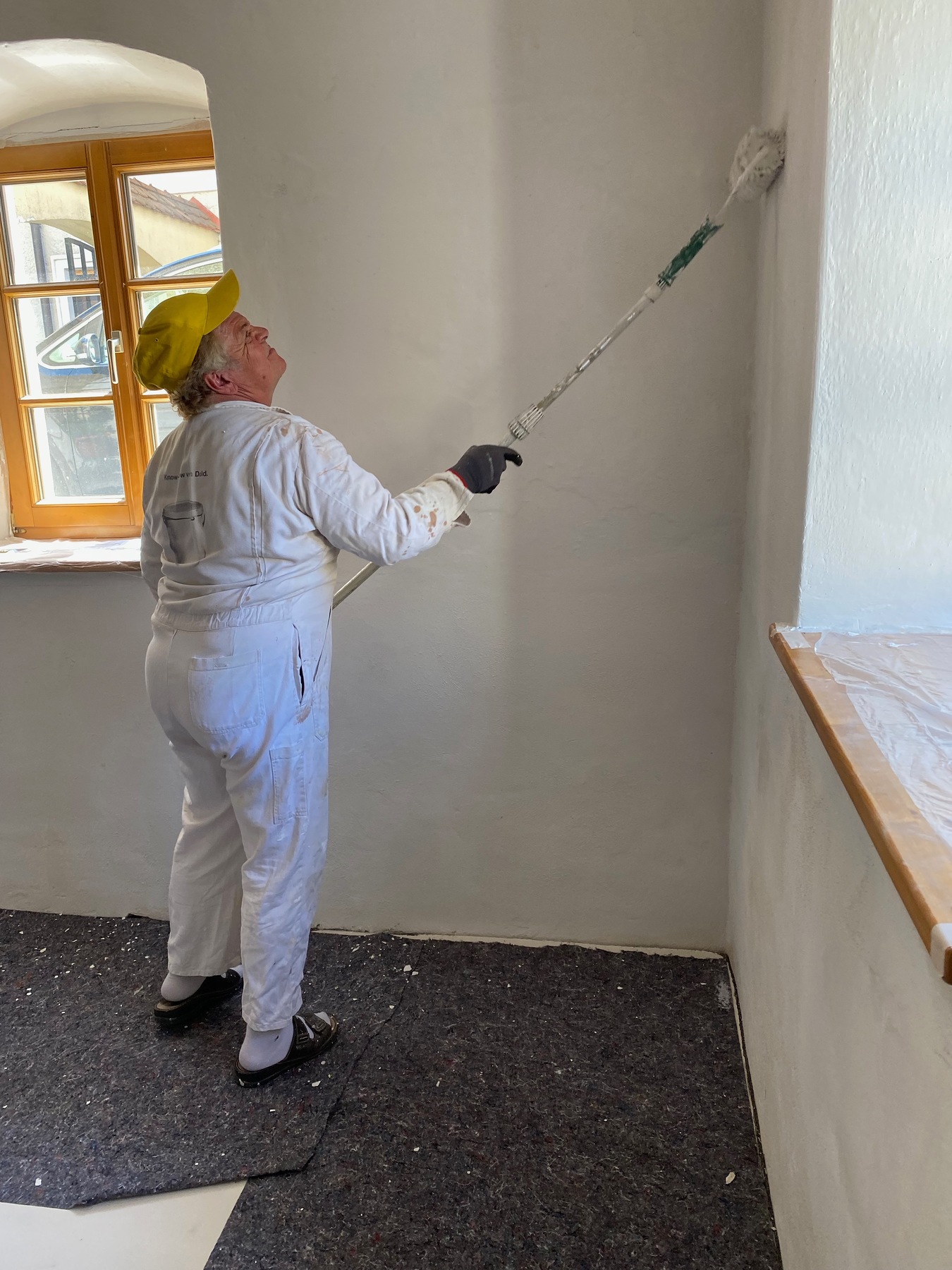 Den in die Höhe gewachsenen Raum wurde eine Akustik- Lochdecke eingezogen kaum war diese fix montiert, rollten auch schon die Maler an und pinselten nicht nur das neue Büro, sondern auch den Vorraum in neuem Weiß.