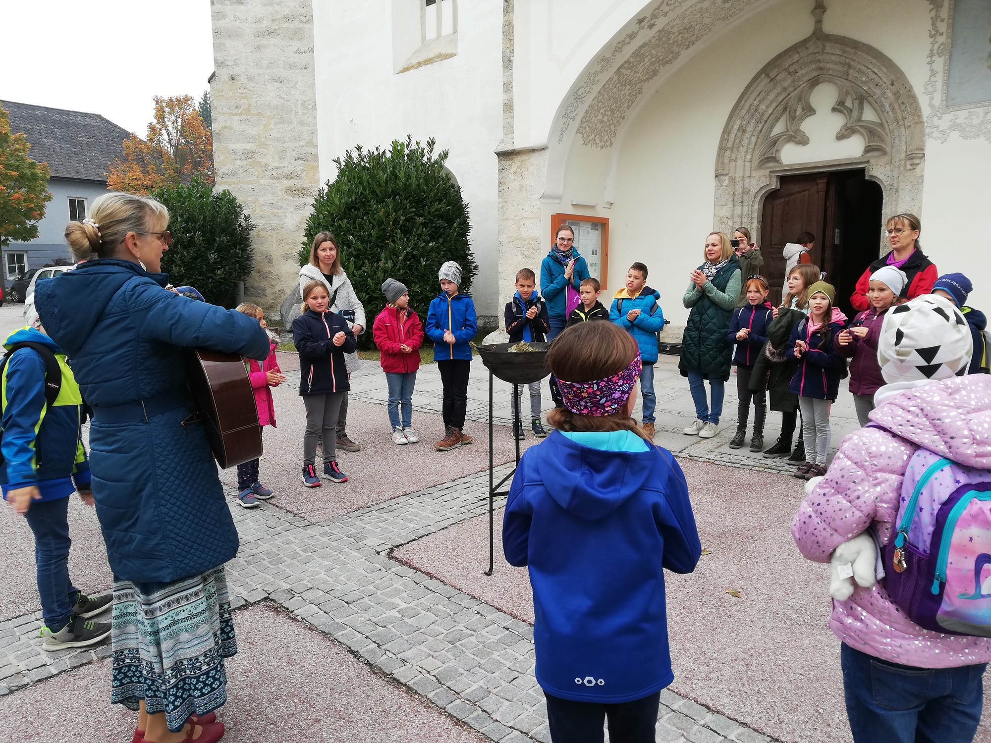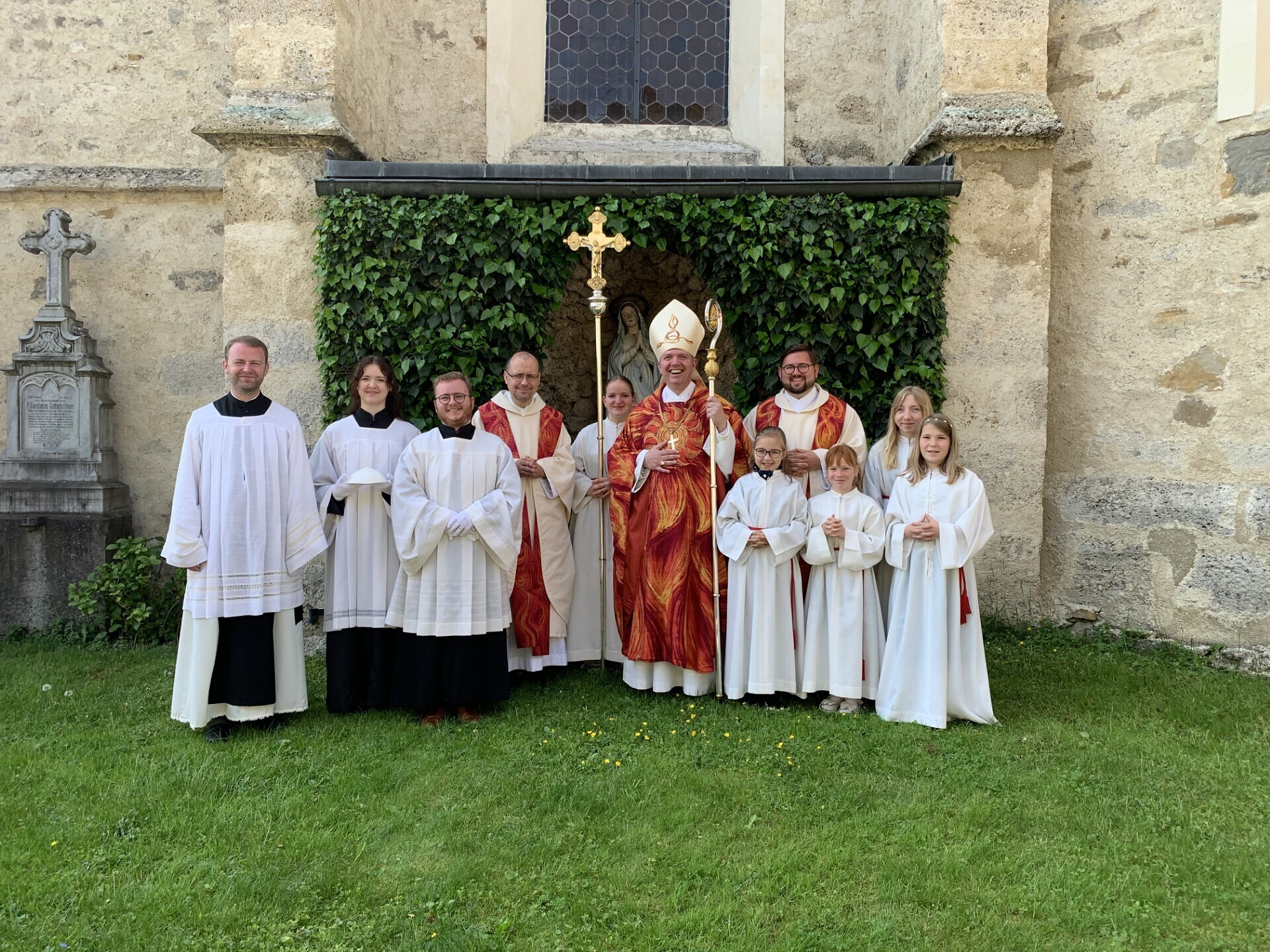 Gemeinsam mit P. Jakobus und vielen Familien mit Kindern feierten wir am 6. Mai 2023 bei der Hubertuskapelle eine Kindermaiandacht.